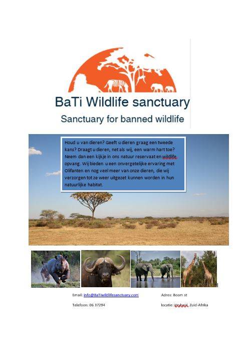 Opzoek naar een leuk dagje uit tussen de Afrikaanse giganten? Kom dan een gezellig dagje naar BaTi wildlife sanctuary waar je elke dag verschillende opgevangen diersoorten kunt bewonderen in hun uitgebreide beboste vlaktes. Kijk voor al onze mogelijkheden vooral even bij de arrangementen in de link hieronder.